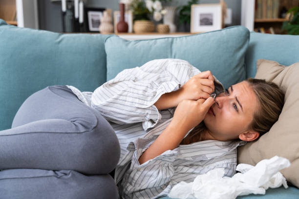Young sad depressed woman lying on the bed smelling boyfriends shirt, feeling miserable she miss him and he is a soldier in military or sick in hospital.